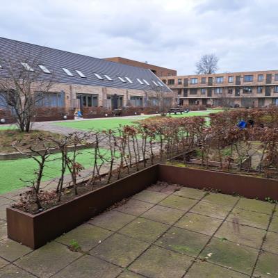 De entree is via de gezamenlijke binnentuin, hier heeft u een terras op het dak van de parkeergarage. .