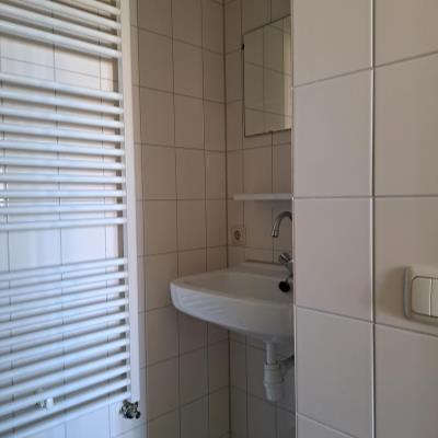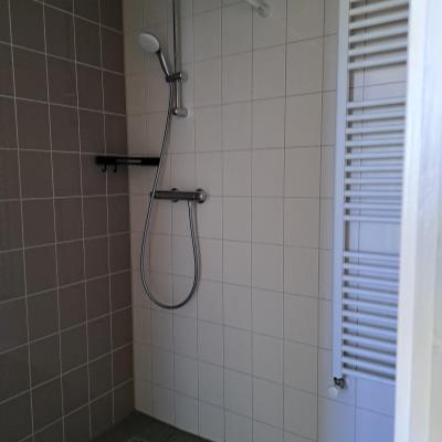 Compacte badkamer met douche en wastafel. Op de begane grond heeft u een privé berging.